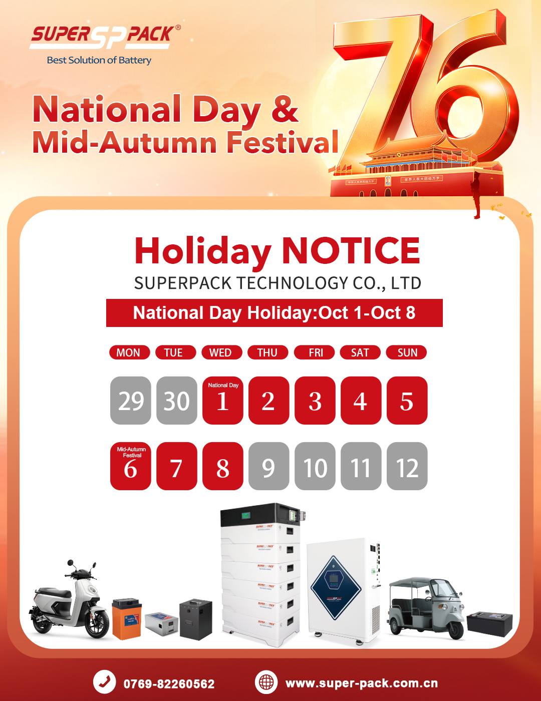 Please be informed that our office will be closed from October 1st to October 8th in observance of China's National Day holiday and the Mid-Autumn Festival. We will resume normal operations on October 9th.